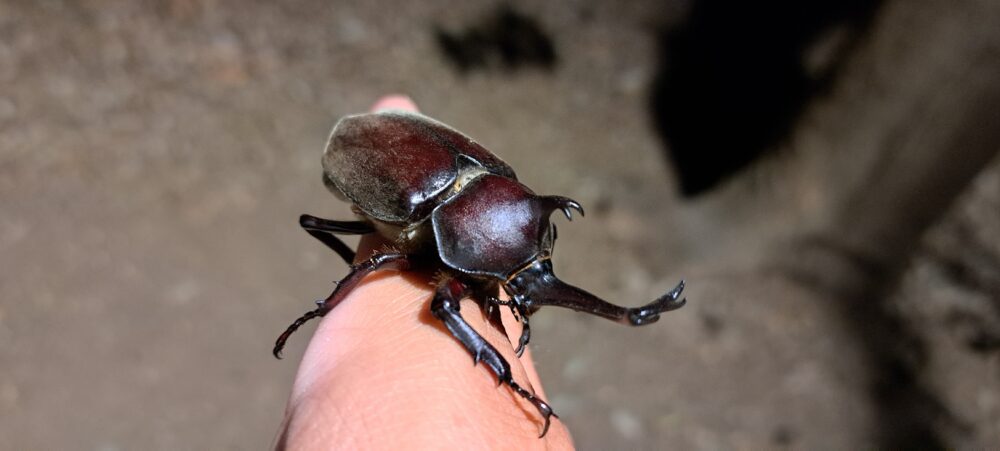 たまに道路で踏まれてしまっているので、道にいるカブトムシは林にもどすようにしています。
