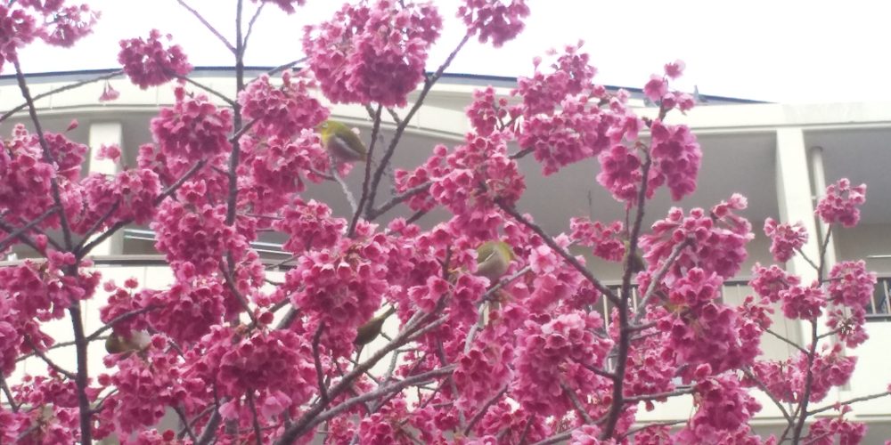 寒緋桜にたくさんのメジロが…